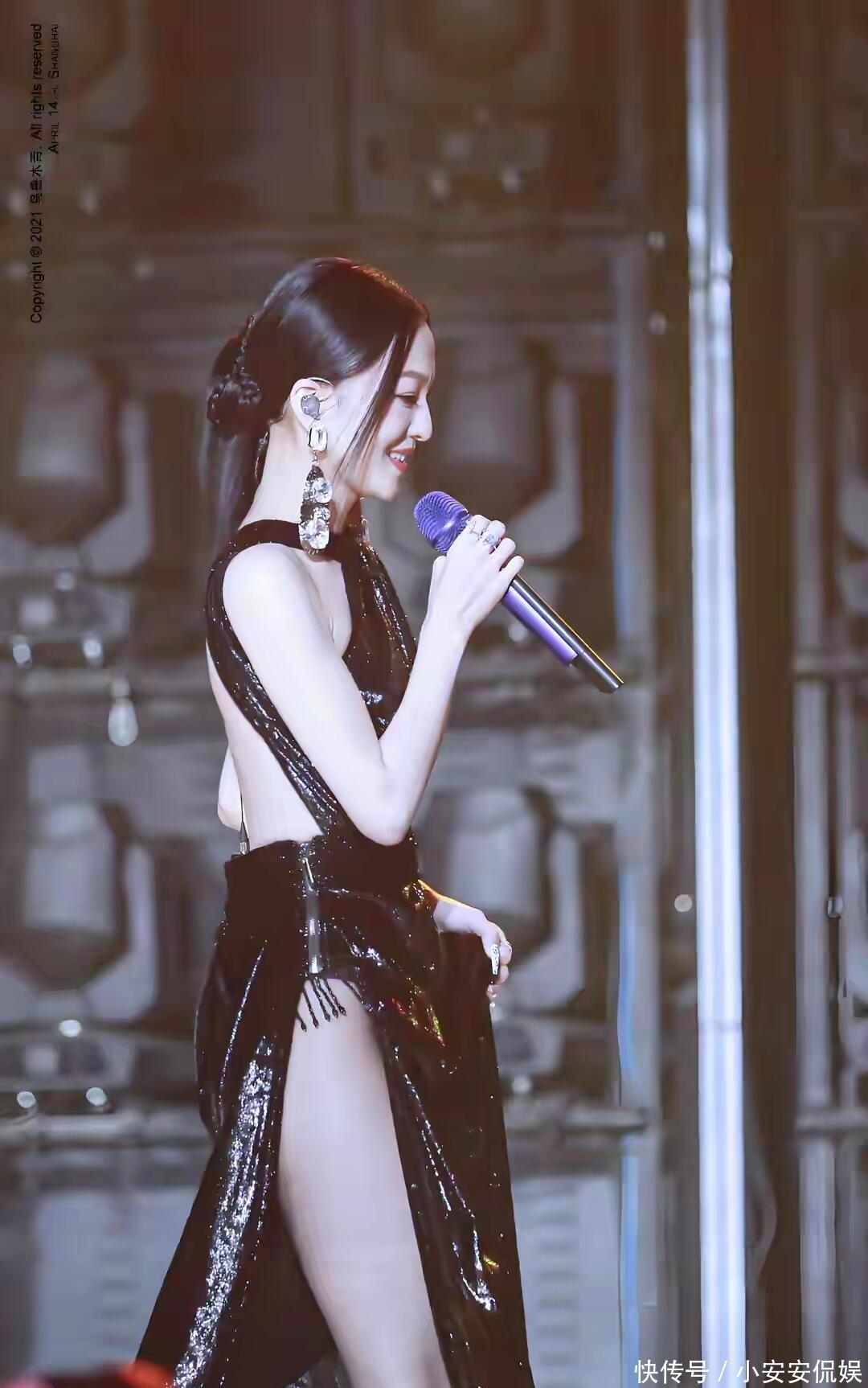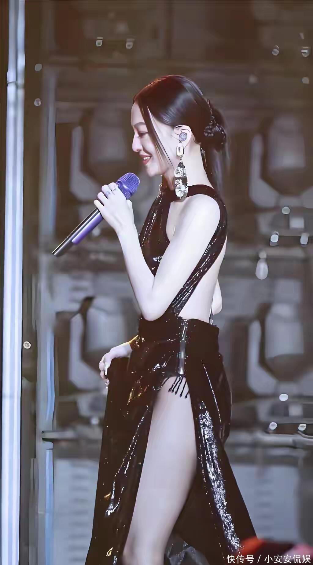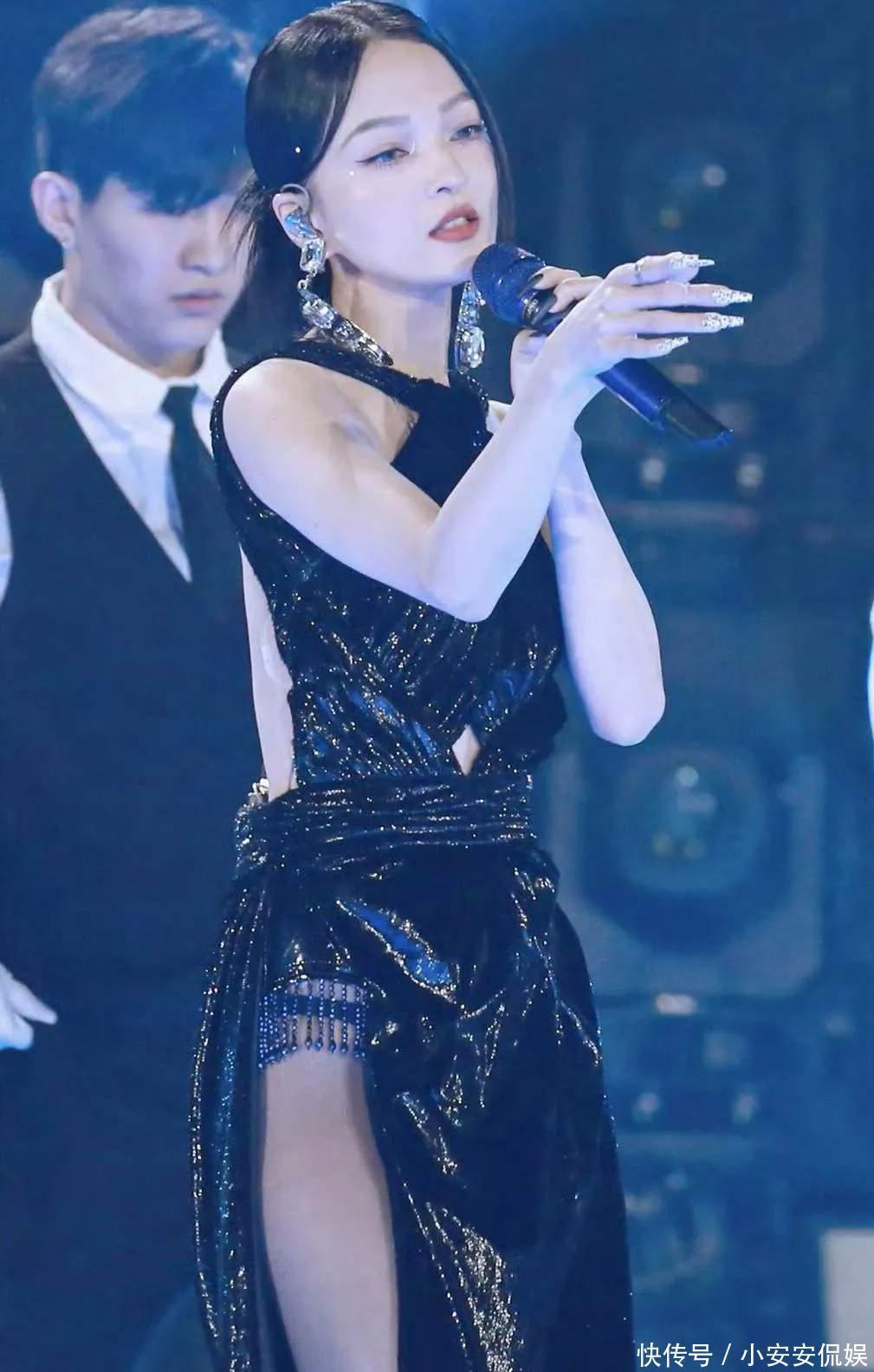 点开她这套图的瞬间,我直接存了屏保:亮面黑裙的光泽像流动的星河,腰腹的镂空是 “呼吸口”,高开叉里的黑丝是 “点睛笔”—— 既没抢她的歌声,又让舞台有了记忆点。但评论区的 “战火” 直接烧到穿搭:“43 岁穿这个不合适”“不如穿回以前的仙女裙”。
